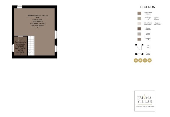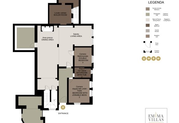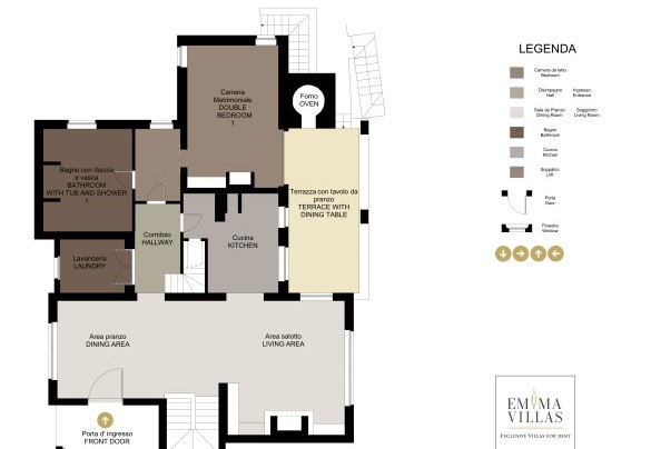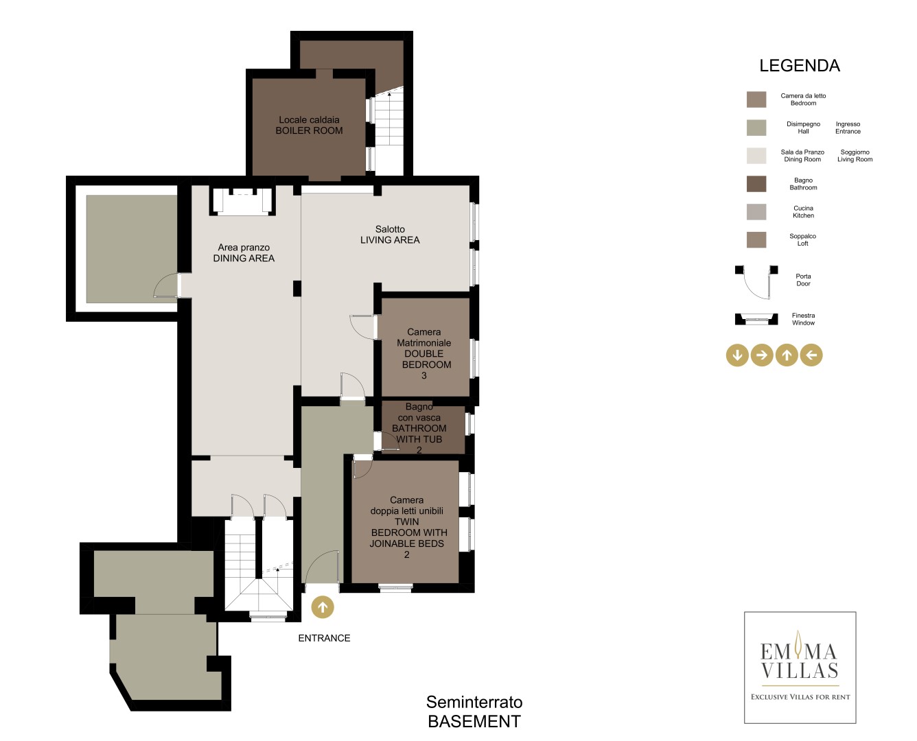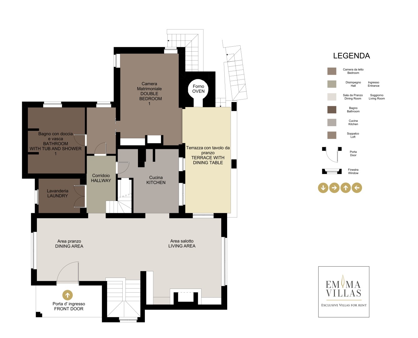 La proprietà e suddivisa in tre livelli. L'ingresso principale si trova al piano intermedio composto da una sala da pranzo con grande vetrata panoramica, un salotto con caminetto e accesso diretto al terrazzo attrezzato con tavolo da pranzo, e una cucina dotata di tutti gli accessori e barbecue. Sempre su questo piano si trovano, una camera matrimoniale con camino d’epoca ornamentale, un bagno con vasca e doccia e un locale lavanderia. Dal salone una scala in cotto conduce al piano seminterrato composto da un ampio salone suddiviso in sala pranzo con camino e salottino con comode panche e tavolo da gioco. Dall’altro lato del salone si raggiunge una camera matrimoniale con letto alla francese, una camera doppia ed un bagno con vasca. Sempre dal piano intermedio, tramite una scala di legno massiccio collocata vicino alla sala da pranzo, si accede alla mansarda composta da una camera con due letti matrimoniali, caminetto e bagno en suite con doccia. N.b. Il caminetto del salotto al piano intermedio è funzionante, gli altri sono ornamentali.