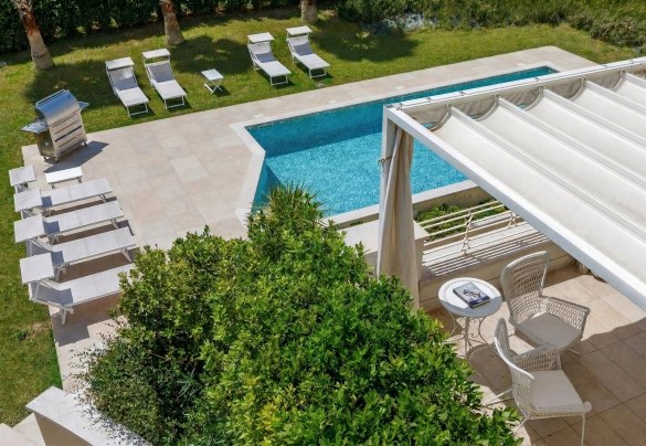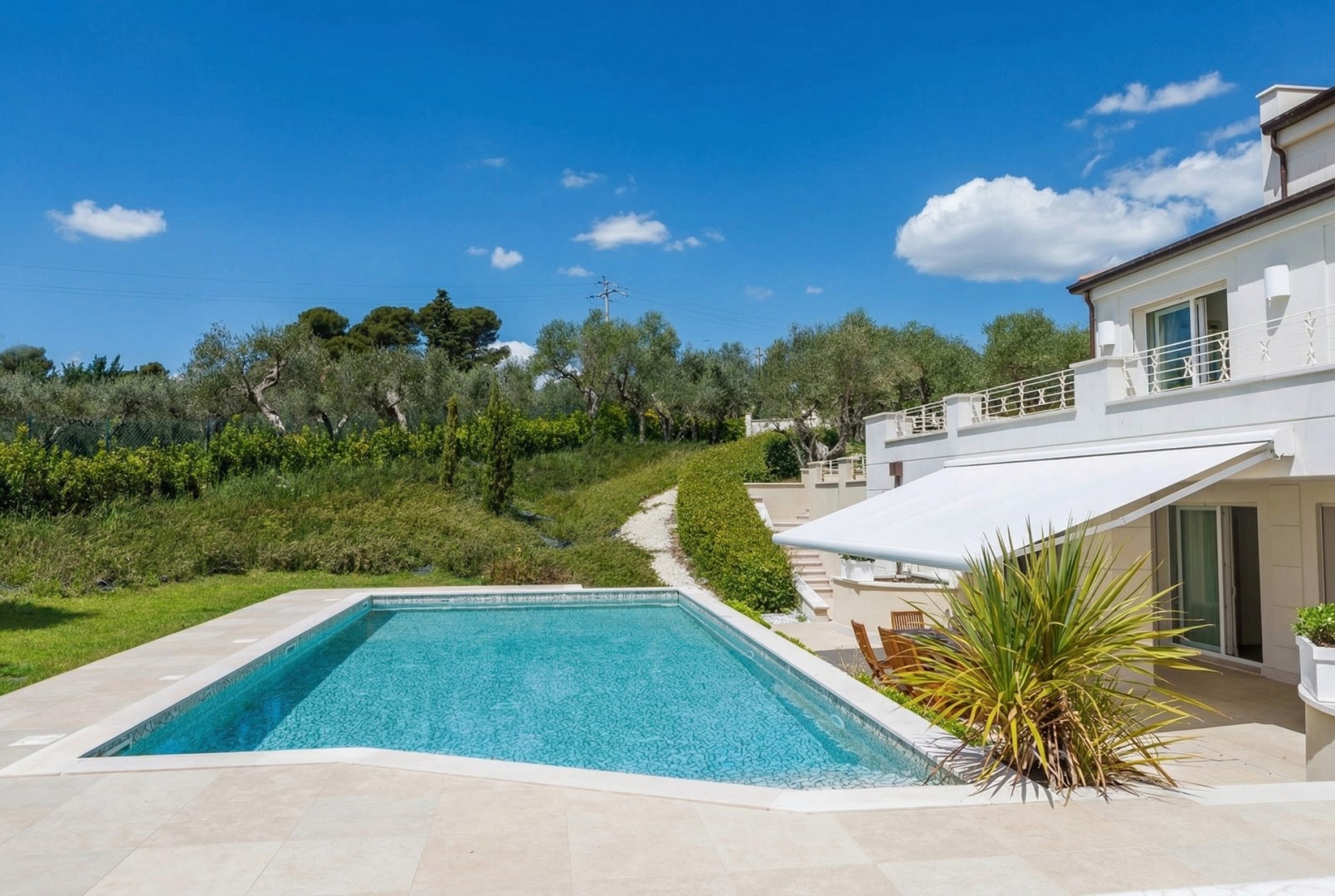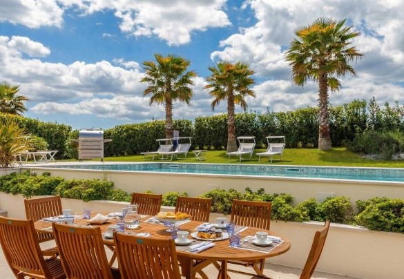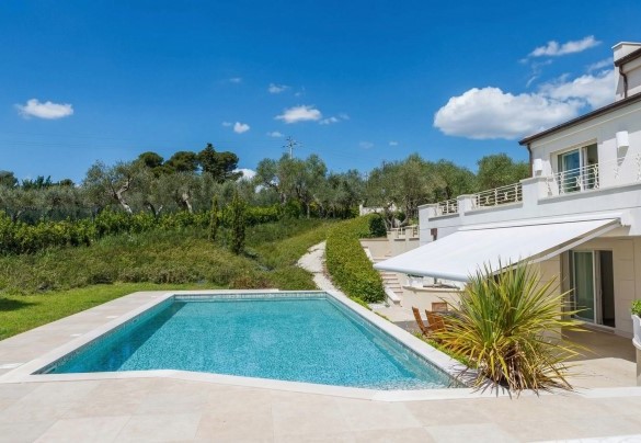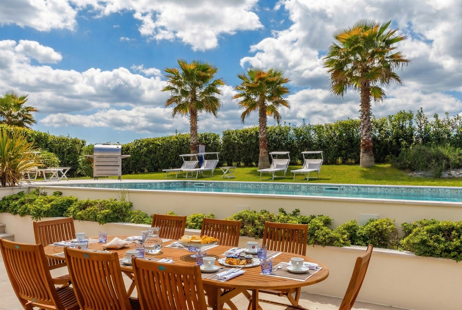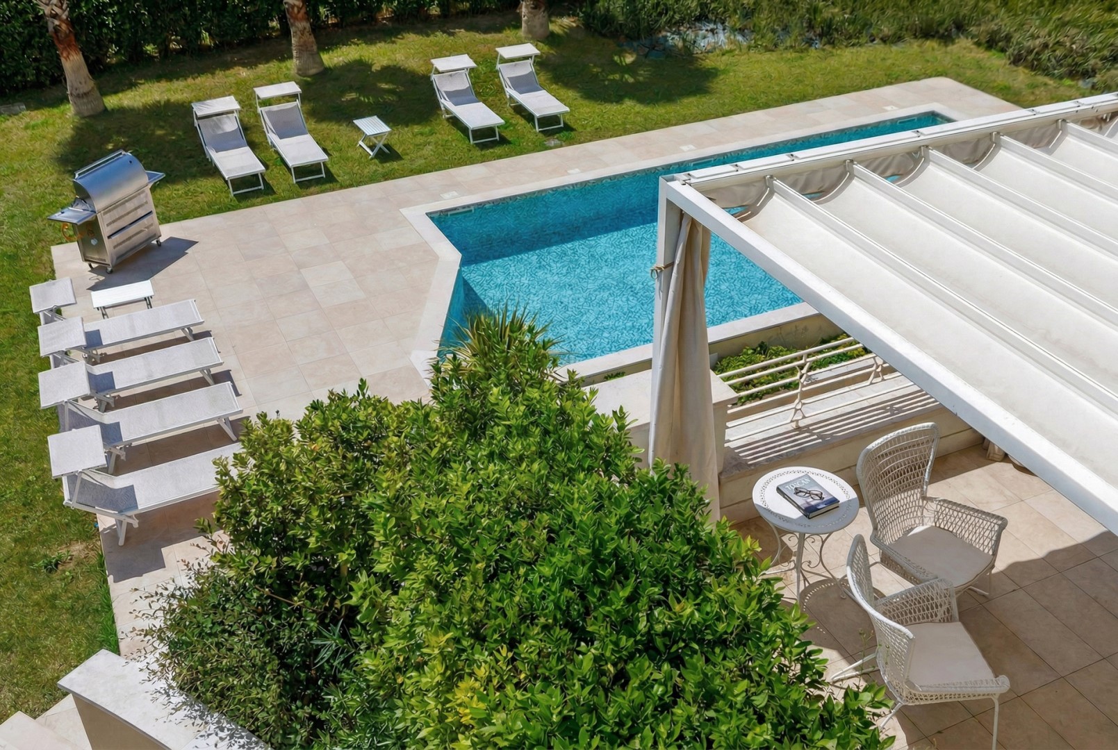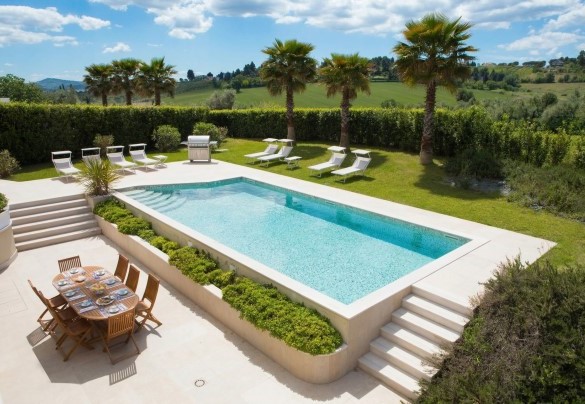L’accogliente piscina è collocata all’interno del giardino piantumato e garantisce un’assoluta privacy. E’ posta proprio di fronte alla villa e vi si accede tramite due scalinate da 6 gradini ciascuna, uscendo dalla zona giorno mediante vetrate scorrevoli molto ampie. La vasca rettangolare irregolare, ha il bordo pavimentato largo 50 cm ed è fornita di scalinata degradante. La piscina misura 11 x 5 m con profondità costante di 130 cm ed è rivestita in piastrelle bianche. L’impianto di depurazione è a cloro e la piscina è dotata di illuminazione sia interna che esterna. La zona solarium è attrezzata con lettini, mentre nel prato ben curato del giardino che la circonda, è possibile soffermarsi per dei momenti di pieno relax o gioco. La piscina è a disposizione dall’ultimo sabato di aprile al primo sabato di ottobre.